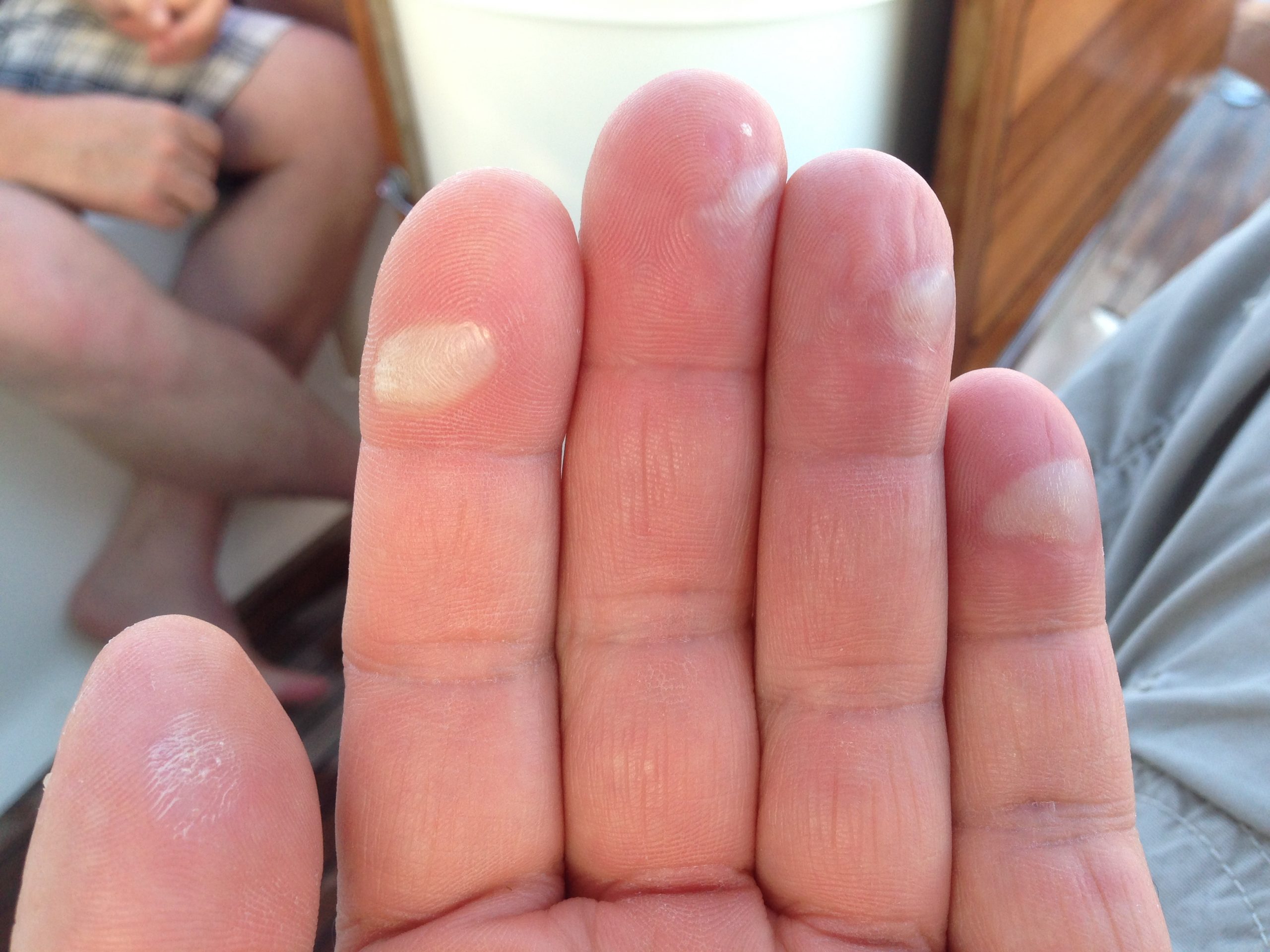 So sahen meine Finger aus, nachdem eine Leine durch meine Hand gerauscht ist und ich sie festhalten wollte. Ich hatte nur Handschuhe mit kurzen Fingern an. Die Blasen haben mich den ganzen Urlaub behindert, sehr ärgerlich. Ich bevorzuge seitdem Handschuhe mit langen Fingern.